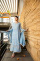 This lovely peach Dust piece is a hand-embroidered viscose chiffon shirt with Chikankari and Mukaish, and it has beautifully crafted details with lace on the neckline and golden mukaish work mixed with Gota Patti all over shirt sleeves and Daman. Paired with pure raw silk trousers A coordinating viscose dupatta completes the look with grace.