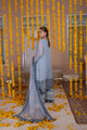 ATTRIBUTE: This captivating black with its flawless blend of form and color, leaves one spellbound. Sea green chiffon forms the base of this flowy ensemble, adorned with gold thread, sequins, and a heavily embellished bodice. Paired with an embroidered chiffon dupatta and a trouser with an embroidered hem, it’s a stunning choice for those who seek grace and grandeur.