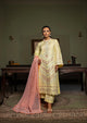 This vibrant mustard ensemble speaks in blooming florals and soft threads. The front-open shirt is not just stitched—it’s sketched in thread, each pink and purple bloom a note of joy, each green vine a path of calm. A companion in form and tone, the matching cotton trouser carries subtle embroidery on the hem borders. A weightless chiffon dupatta, bordered with lace on all four sides, flows like a soft sigh through time.