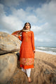 Experience the richness of expert craftsmanship with this traditional RED and ORANGE ensemble with an alluring contrasting shade of embroidery rendered on a divine shade of Red with a contrasting VIBRANT ORANGE dupatta complementing with plain raw silk trouser.